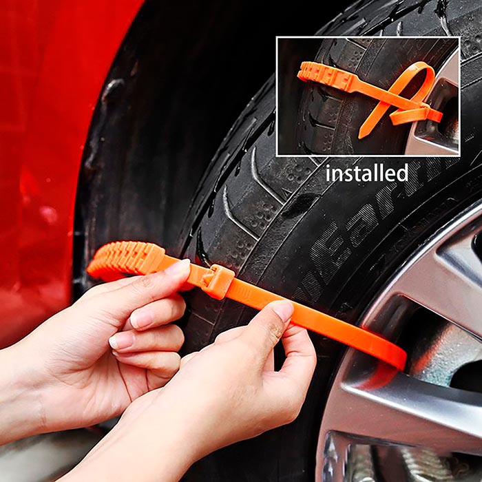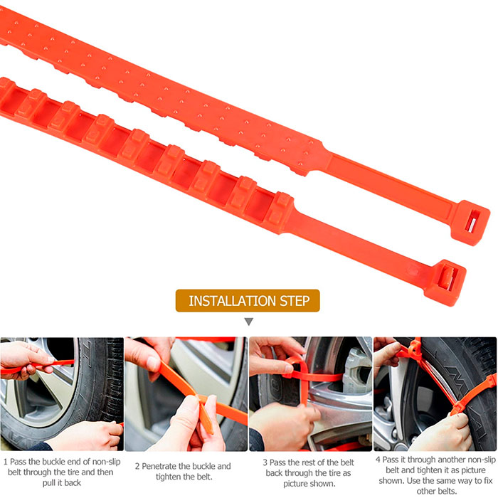 Vhodné pre autá. Nevhodné pre nákladné autá a iné vozidlá s väčšími pneumatikami. Prevliekajte pás cez otvor na pneumatike, najprv ho prevlečte cez zadnú stranu a potom pripevnite vpredu. Sú opakovane použiteľné.