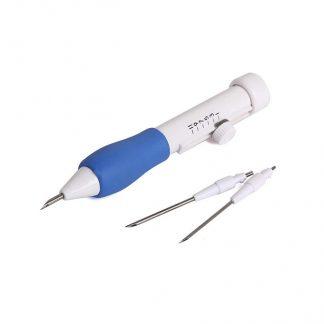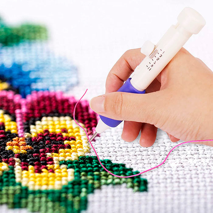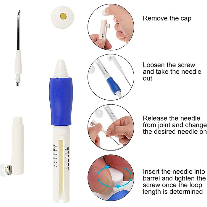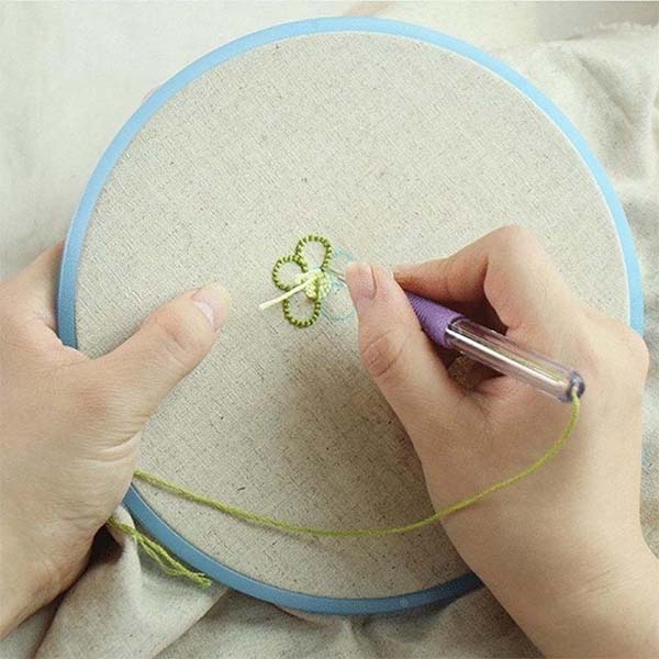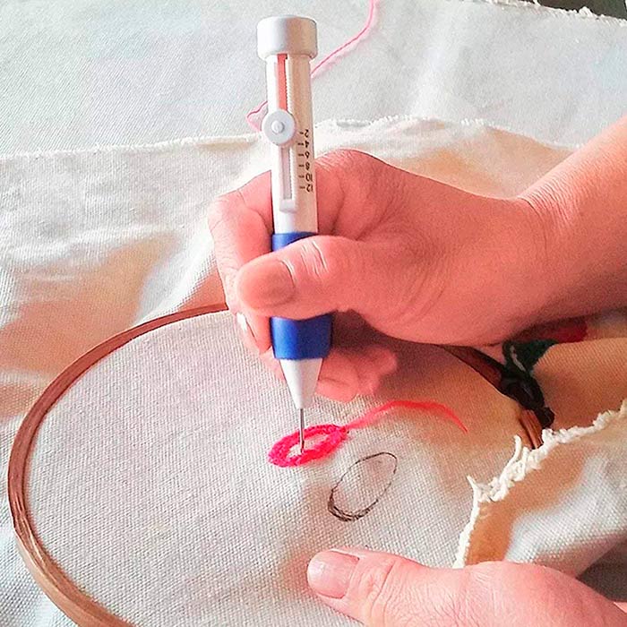 Vložte vložku s niťou a keď sa objaví na druhom konci, vložte do nej požadovanú niť a pretiahnite ju cez pero, kým sa neobjaví na druhej strane. Vytiahnite vložku s niťou a prestrčte ju cez zadnú časť oka, znovu vložte niť a pretiahnite ju cez ucho. Po dokončení nechajte na konci očka asi centimeter nite. Keď začnete vyšívať, je veľmi dôležité, aby ste cievkovú hlavu pretlačili až na začiatok plastovej časti pera. Aby boli vaše výrobky naozaj dokonalé, dbajte na rovnomerný pohyb a rozostupy stehov. Ak náhodou urobíte chybu, vytiahnite niť zo stehu, pretrite látku, aby ste uzavreli stehové otvory, a začnite znova.